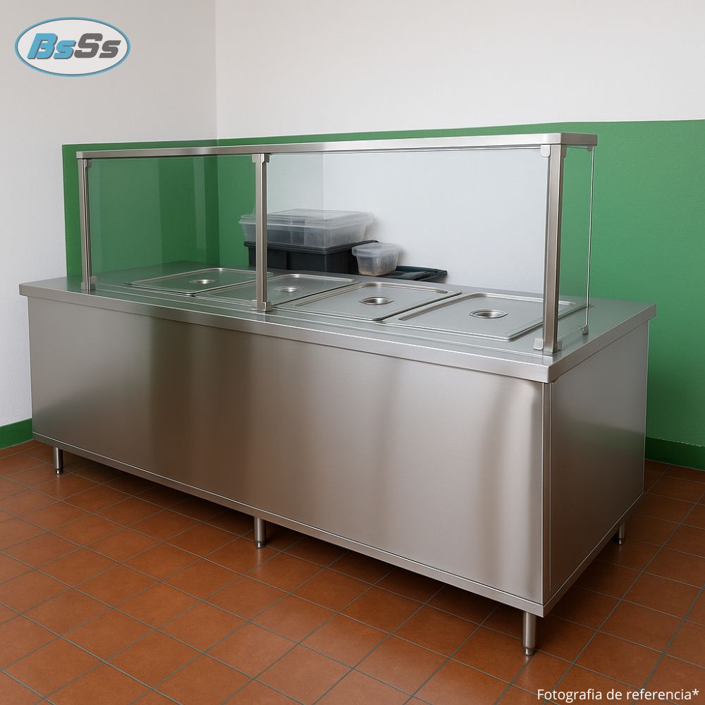Baño maría de cuatro puestos fabricado en acero inoxidable AISI 304, ideal para mantener alimentos calientes en condiciones seguras e higiénicas.