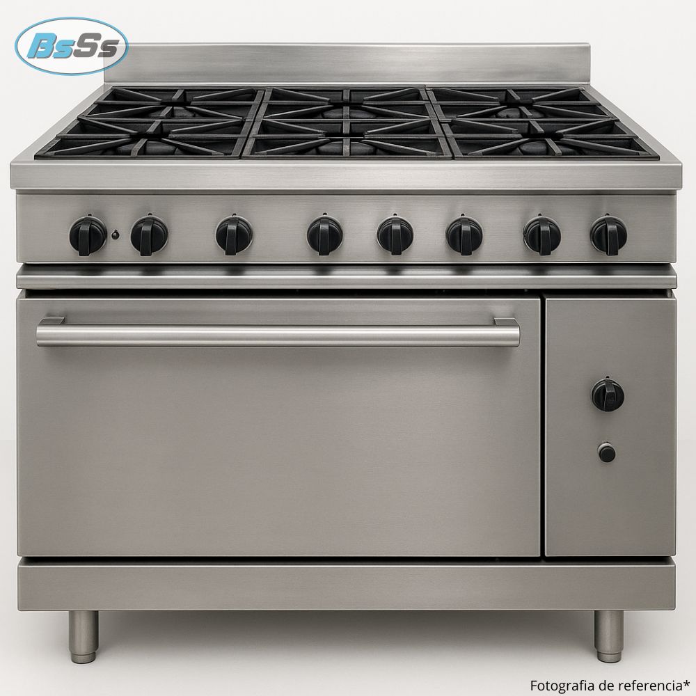 Equipada con cuatro quemadores tipo corona de alto poder calórico y horno inferior de gran capacidad, diseñada para uso continuo en restaurantes, panaderías, hoteles y comedores industriales.