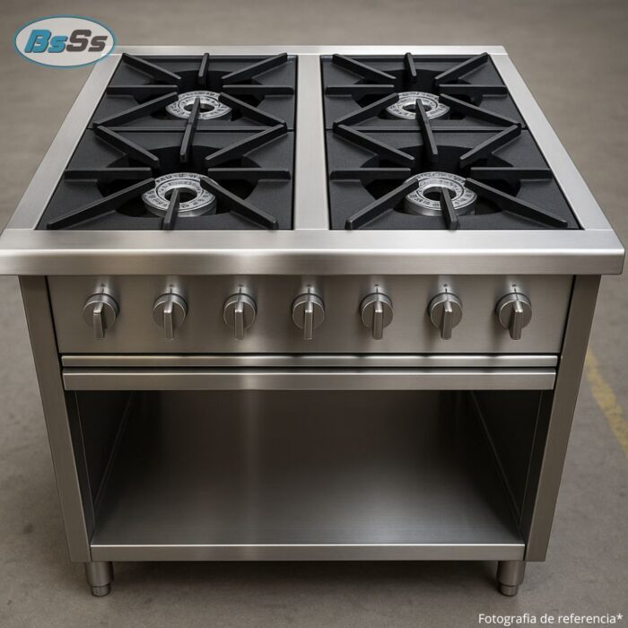 Estufa industrial de cuatro puestos ideal para cocinas de alto rendimiento como restaurantes, hoteles, comedores institucionales y plantas de producción alimentaria. Fabricada en acero inoxidable AISI 304 y equipada con quemadores tipo corona de alto poder calórico, permite una cocción rápida, uniforme y constante.