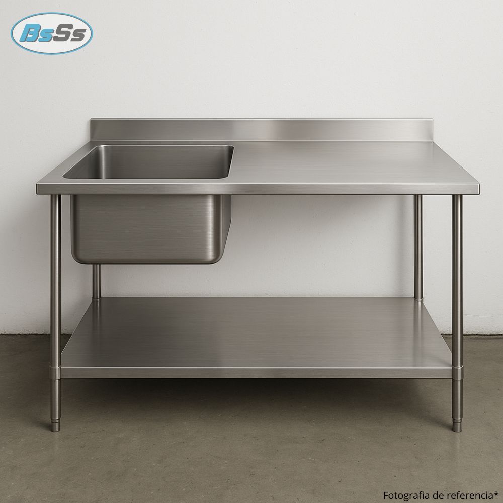 Mesa de trabajo con poceta en acero inoxidable AISI 304, ideal para cocinas que necesitan limpieza, organización y durabilidad en un solo equipo. Incluye un práctico salpicadero trasero que protege el muro, una poceta integrada para lavado rápido de alimentos o utensilios y un entrepaño inferior que optimiza el espacio de almacenamiento.