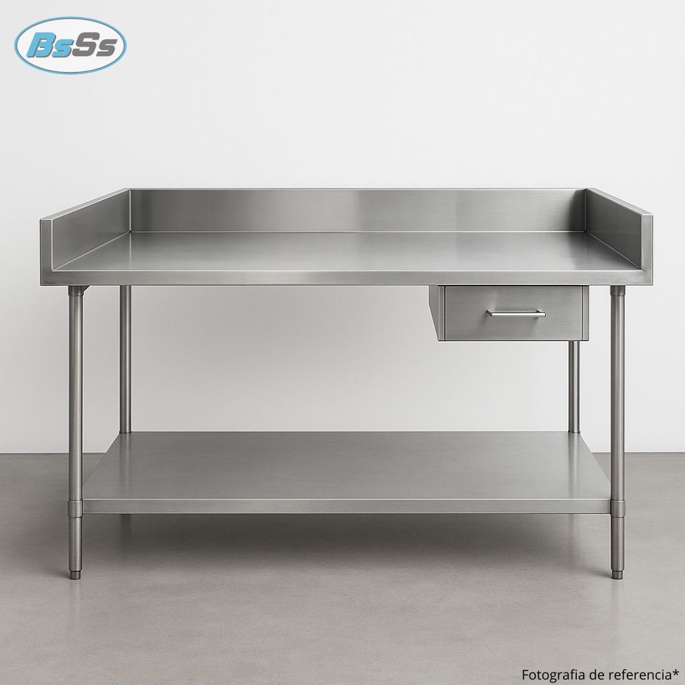 Mesa de trabajo en acero inoxidable con cajón cubiertero, salpicadero en tres lados y un entrepaño inferior, pensada para cocinas profesionales que necesitan organización, resistencia e higiene. El salpicadero en forma de “U” evita salpicaduras en la pared y laterales, manteniendo el área de trabajo limpia y segura.