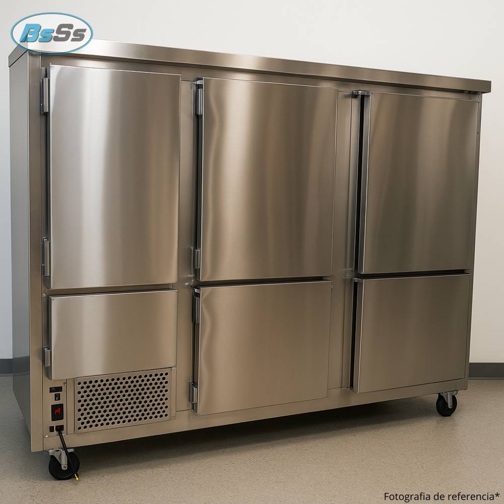 Nevera vertical de tres cuerpos fabricada con interior y exterior en acero inoxidable referencia 430 o 304, ideal para operaciones de gran volumen que requieren máxima capacidad de refrigeración o congelación. Sus puertas selladas en acero inoxidable proporcionan aislamiento térmico eficiente, reduciendo la pérdida de frío y el consumo energético. Incorpora un control digital de temperatura que permite monitorear y ajustar el sistema con precisión. Diseñada para entornos profesionales como centrales de abasto, hoteles, supermercados y cocinas industriales.