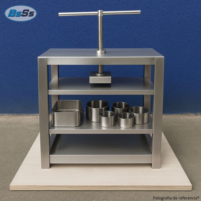 Fabricada en acero inoxidable AISI 304 grado alimentario, esta prensa cuenta con un sistema de presión ajustable que permite moldear bloques de queso de forma uniforme, eliminando el suero sin afectar la estructura del producto.