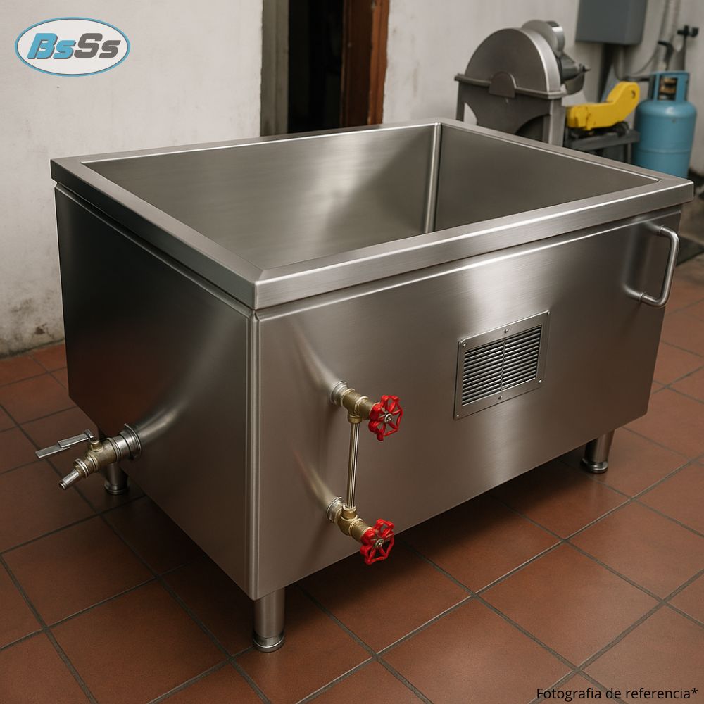Fabricado completamente en acero inoxidable AISI 304, con cuba interna en calibre 10 especial para alimentos, doble camisa tipo baño María y calentamiento mediante vapor generado por caldera externa. El agitador tipo ancla o propela, impulsado por un motoreductor de 1 ½ HP, asegura una mezcla homogénea.