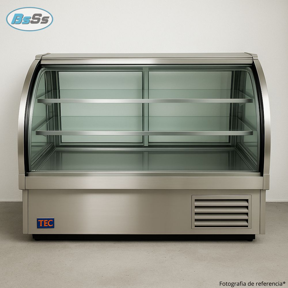 Vitrina refrigerada exhibidora ideal para pastelería, charcutería o carnes frías. Fabricada en acero inoxidable referencia 430 con entrepaños resistentes y frente en vidrio curvo templado para una excelente visibilidad del producto.